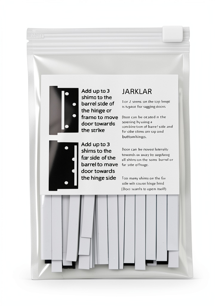 JARKLAR magnetic hinge shims are specifically designed for door mounting applications where precise alignment is crucial. They are ideal for commercial door installers, maintenance professionals, and property managers dealing with sagging or misaligned doors. These shims work effectively in various environments including office buildings, retail spaces, hospitals, and residential properties. The stackable design allows users to add or subtract shims to achieve perfect door fitment, eliminating the need for temporary solutions like cardboard or popsicle sticks. Whether addressing hinge settlement over time or initial installation adjustments, these shims provide a professional-grade solution that saves time and prevents door damage.